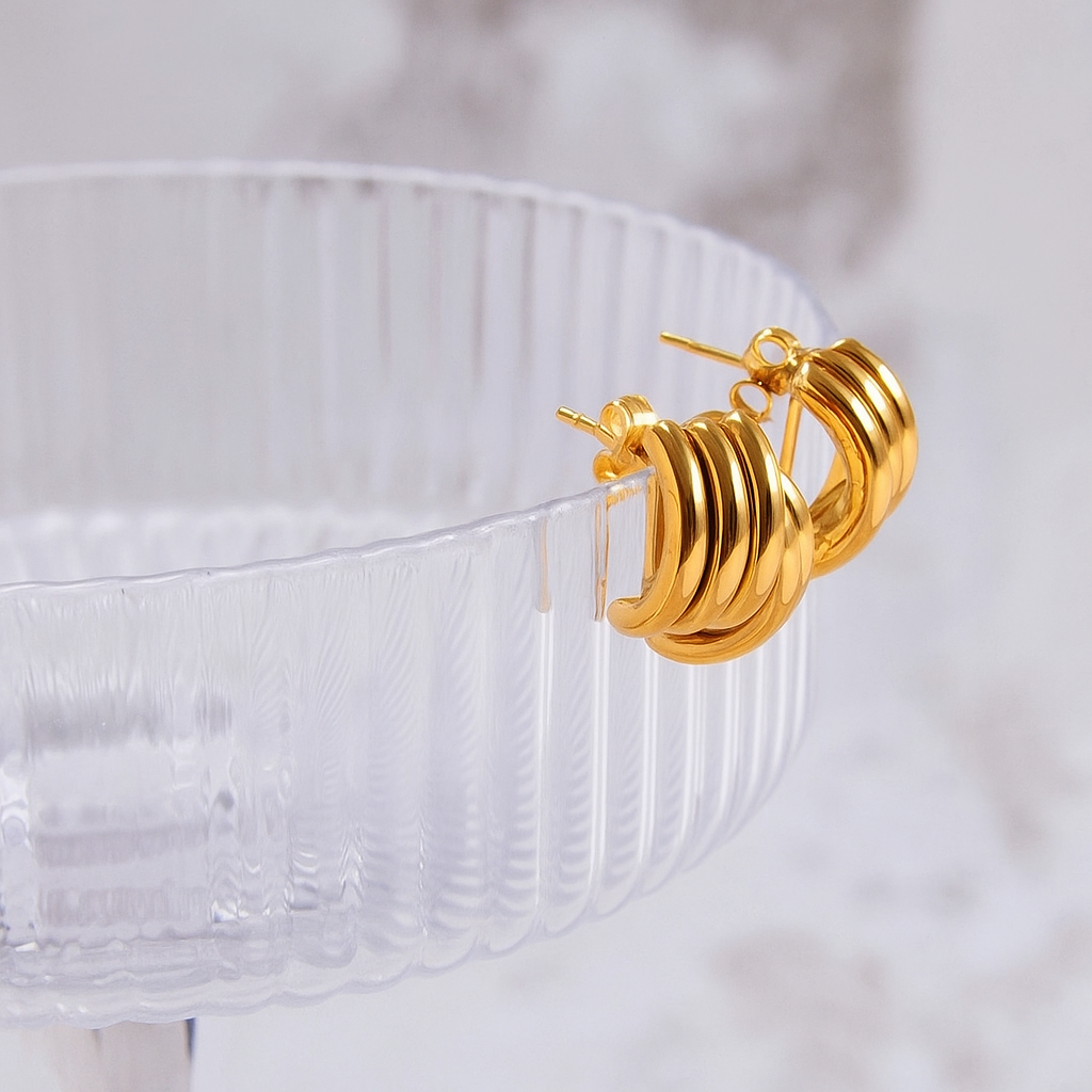 Los Aretes Éline son una declaración de fuerza y elegancia moderna: un diseño de múltiples aros dorados entrelazados que crean volumen y movimiento con un brillo único.