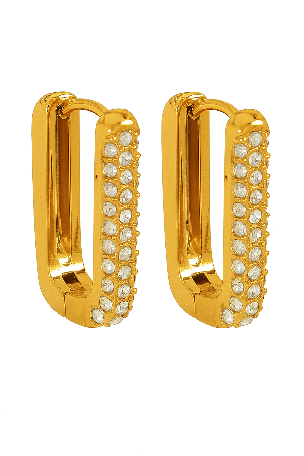 Los Aretes Lumière combinan la geometría moderna con el resplandor del oro y los destellos de pequeñas circonias incrustadas.